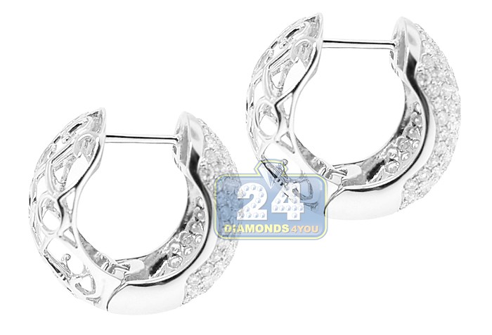Glamorous and elegant, our breathtaking small hoop earrings are artfully created from cool 14 karat white gold with high-polished shiny finish. They're pave-set with a galaxy of sparkling white round brilliant-cut genuine diamonds of 3.80 carats (VS1-VS2, F-G). These women's diamond earrings have height of 20 mm and width of 15 mm. Our impressive diamond hoops feature a secure backing and a outstanding look that lasts forever!