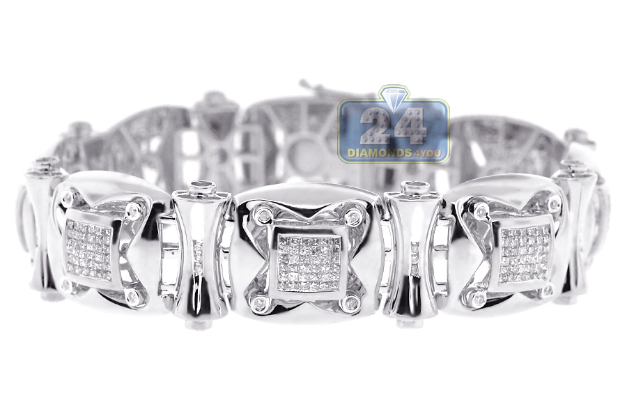 This diamond link bracelet is for a man who appreciates durable and luxurious look! It's artfully handmade of cool 14k white gold, and high-polished for smooth finish. Our men's diamond bracelet features 4.02 carats of icy white princess-, round brilliant-cut genuine diamonds. It measures 8.25 inches in length and 18 mm in width. This diamond wrist bracelet is a symphony of color, sparkle and style!
