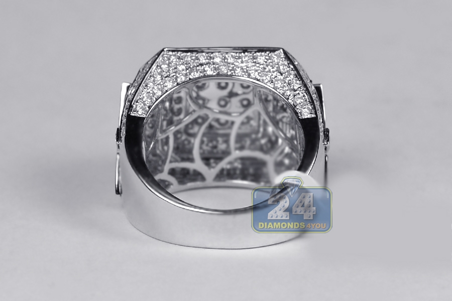 Our men's diamond ring sparkles on the hand making unforgettable statement! Masterly created from cool 14k white gold, it is iced out with icy white round brilliant-cut genuine diamonds totaling 4.18 carats. Sophisticated men will definitely appreciate all the details of this signet ring!