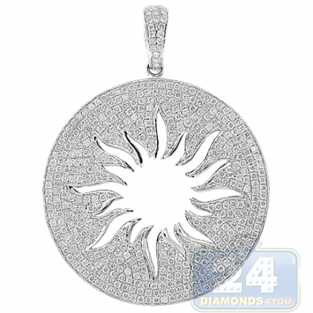 Unique design of our diamond pendant features an intricate sun ornament in the middle that adds an extraordinary accent to the piece! Artfully handmade of cool 14 karat white gold, it features highly polished shimmering look. This sun pendant is paved with 4.21 carats of lustrous white round brilliant-cut natural diamonds (SI1-SI2, G-H). Our women's diamond pendant has dangling length of 57 mm, and the circle is 43 mm in width. Nothing can be brighter than this beautiful diamond sun charm!