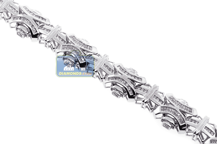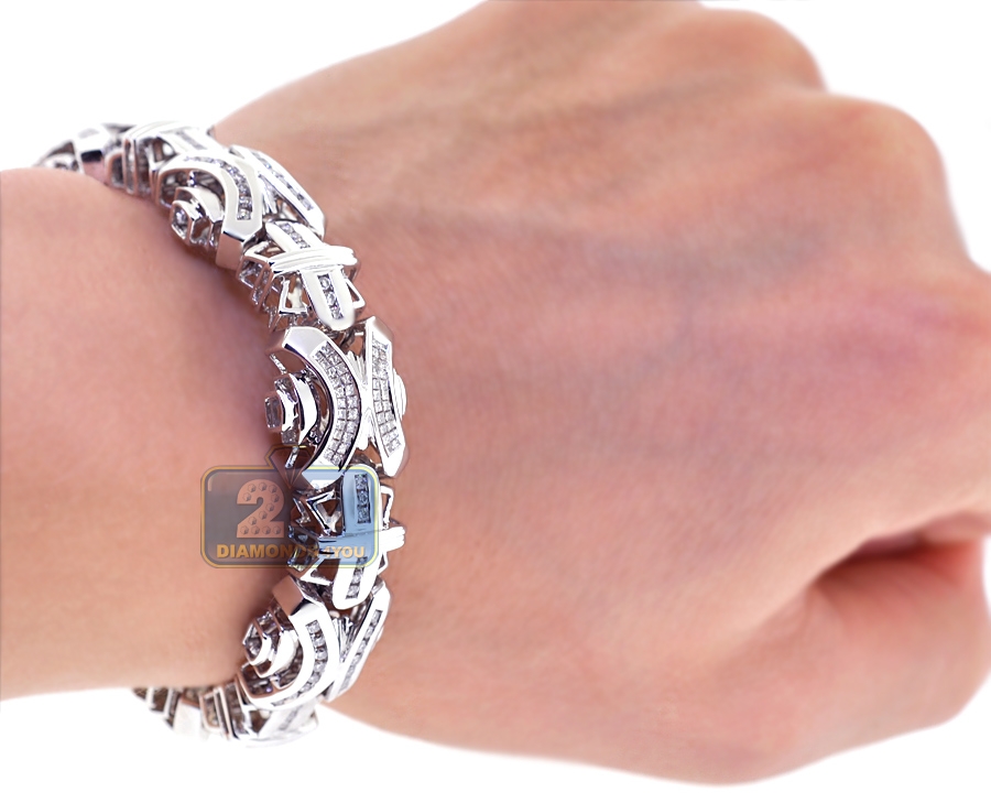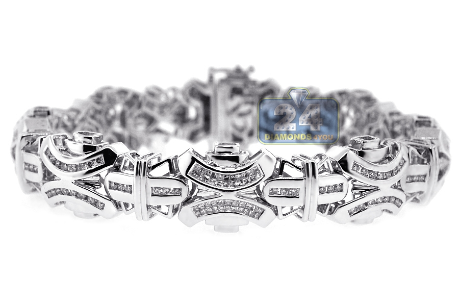 This diamond link bracelet is for a man who appreciates durable and luxurious look! This piece of jewelry is artfully created from gleaming 14k white gold with high-polished smooth finish. Our men's wrist bracelet is set with 4.31 carats of icy white princess-, round brilliant-cut real diamonds. The piece measures 8.5 inches in length and 15 mm in width. This diamond link bracelet is a symphony of color, sparkle and design!