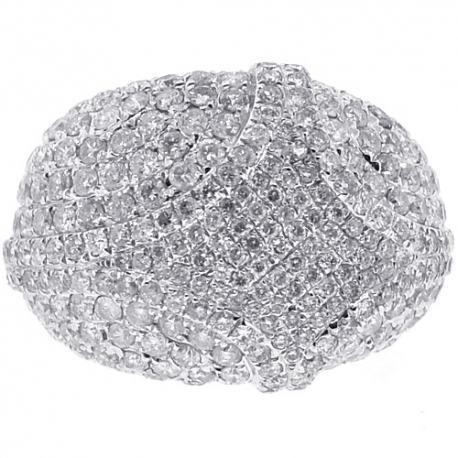 Classic dome design with original pattern is presented in our women's diamond ring! It is expertly produced from cool 14k white gold with high-polished smooth finish. The piece of jewelry is amazed with icy white round brilliant-cut natural diamonds, all weighting 4.63 carats. It also features 19 mm in width, and the shank is 4 mm. This diamond pave band is nothing short of spectacular!