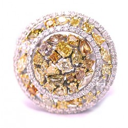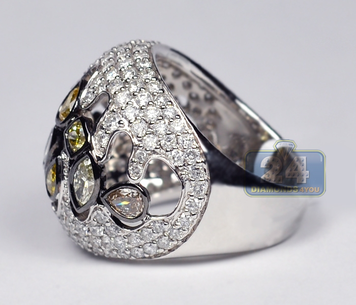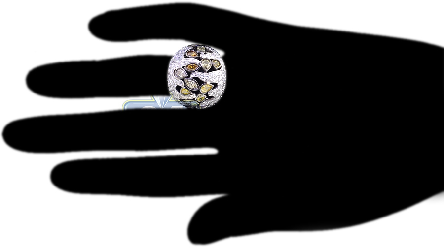 Enjoy the beauty and uniqueness of this impressive colorful dome ring! The jewel is artfully handmade of lustrous 14k white gold with shiny polished finish, and features natural fancy multi-colored and multi-shaped diamonds as well as classic round cut white brilliants. Gorgeous yellow and brown stones with various shadows of pear and oval shapes... She will love the fashionable elegance of this charming ring!