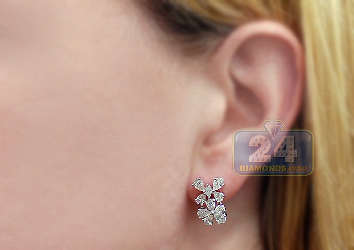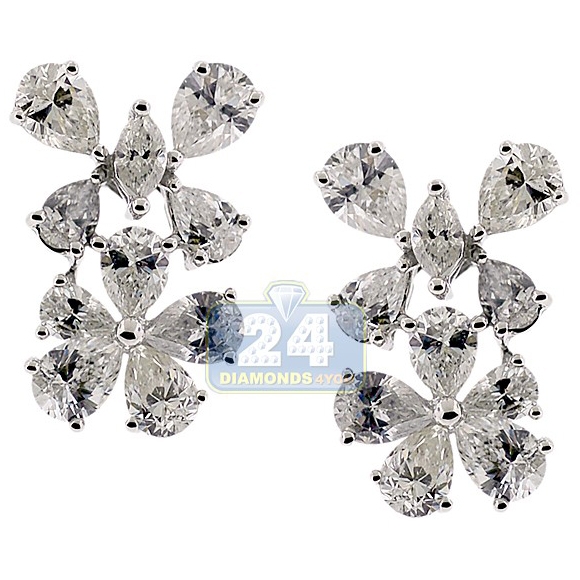 These diamond stud earrings feature a delightful flower design studded with 4.49 carat of icy white marquise- and pear-cu natural diamonds, all totaling 4.49 carats (VS1-VS2 clarity, F-G color). The piece glistens in 14 karat white gold with polished finish. They have height of 18 mm and width of 12 mm. Charming women's diamond earrings will add a hint of sparkle to your casual look!