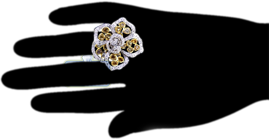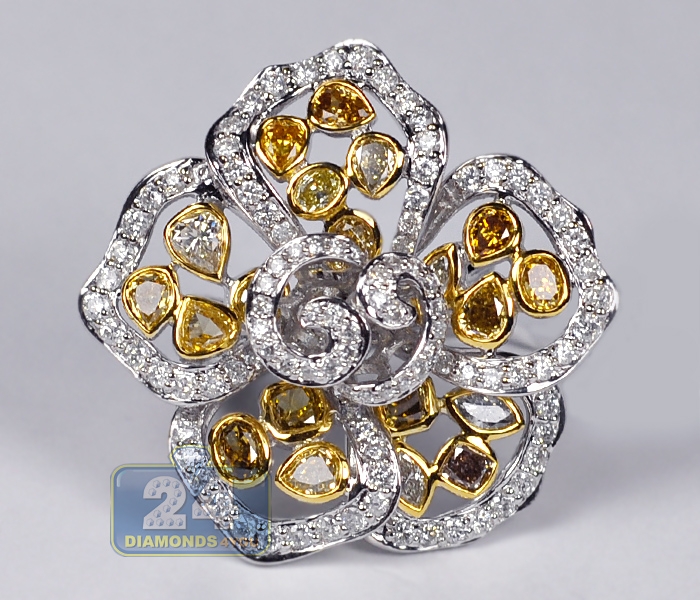 Delicate, extraordinary in design and craftsmanship, our ring is pure luxury! Fabulous natural fancy diamonds of oval and pear shape are masterly encrusted in high polished 14k white gold setting shaped as a gorgeous flower. Icy white brilliants of VS2-SI1 clarity and G-H color are accenting the piece on sides making its contours bright. Are you ready to wear something extremely eye catching and spectacular?