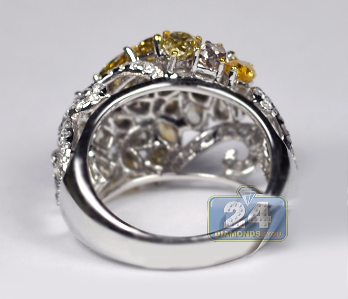 Impressive shapes, unique design, fancy colors and natural materials! All these combined with top notch craftsmanship making this jewel exceptional! Masterly handmade of cool 14k white gold with perfectly polished finish, it features a beautiful dome style covered in dazzling fancy yellow, brown and icy white diamonds of pearl, oval and round shapes. A truly spectacular look for your special person!