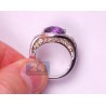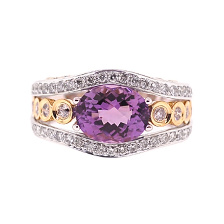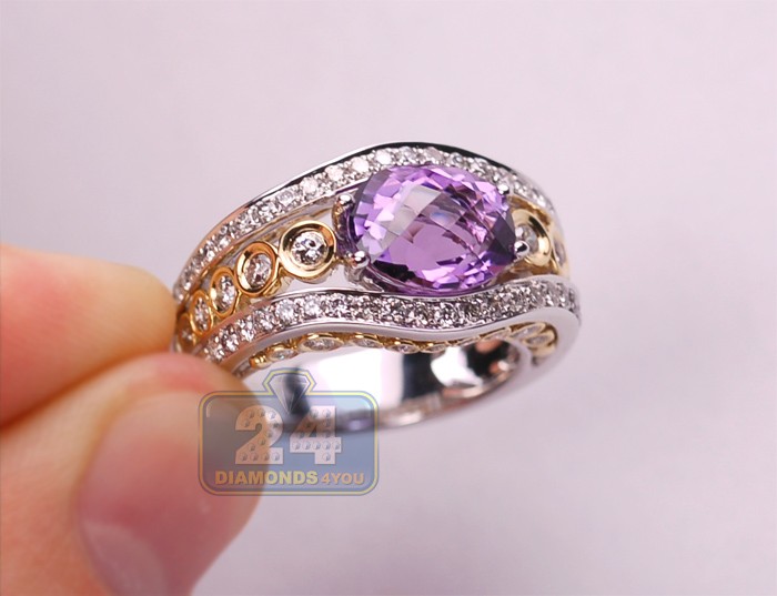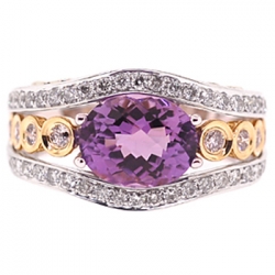 Our masterly designed vintage style ring is just fabulous! The band is professionally crafted in mixed 14k white and yellow gold, has shiny polished finish, and encrusted with natural purple amethyst in the center. Absolutely eye clean and sparkling brilliants of SI1-SI2 clarity and G-H color are masterly handset on sides of this contemporary jewel. Adore your finger with such a special treasure!