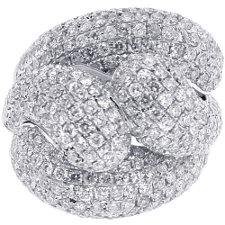 Feminine yet powerful design comes in our diamond double bypass ring! Professionally produced from cool 14k white gold, it has high-polished shimmering look. The piece is paved with 5.17 carats of icy white round brilliant-cut natural diamonds. The top features 25 mm in width, and the shank is 3.5 mm. This women's fancy dome ring is a uniquely stunning find for your collection!