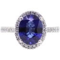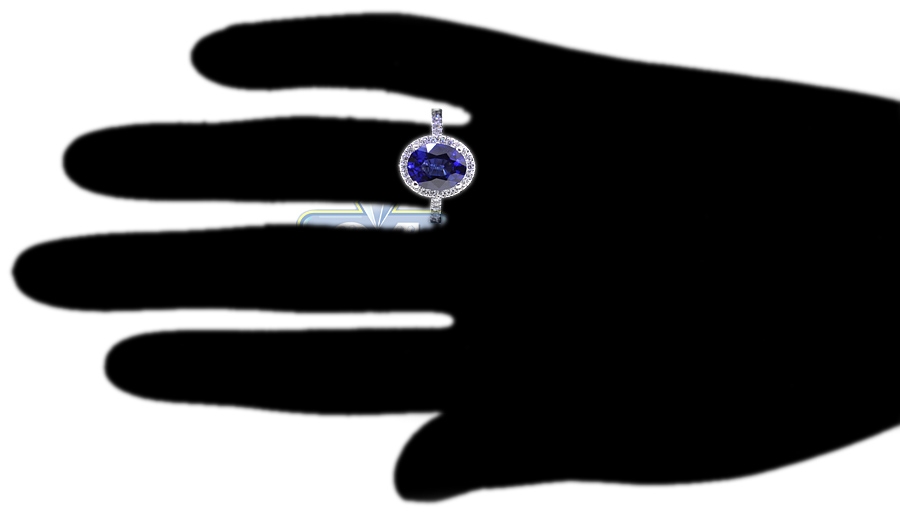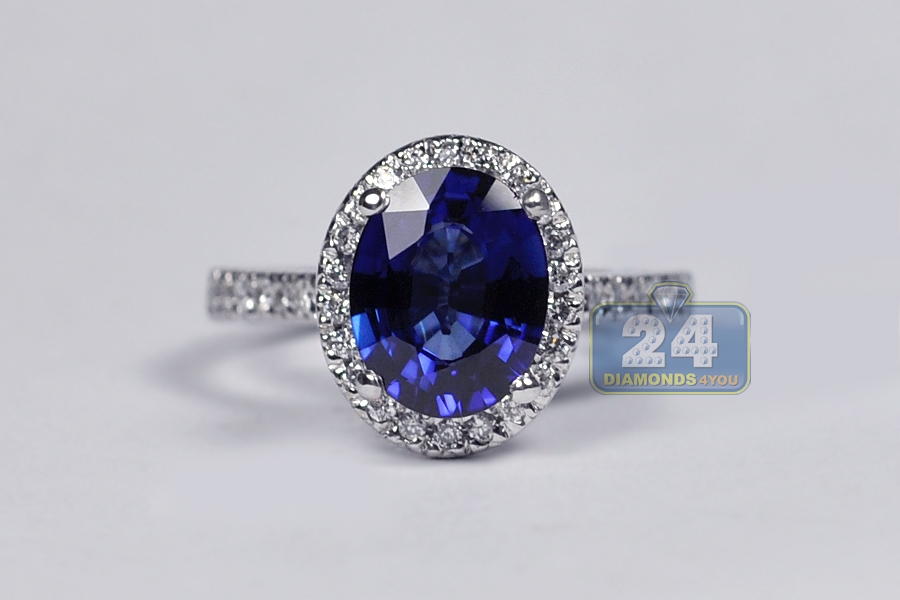 Classic but tempting, our high setting gives this diamond gemstone ring an air of delicacy and charm! Masterly crafted in lustrous 14k white gold, it is encrusted with diffused blue oval-cut natural sapphire in the center (5.35 ct) and icy white round brilliant-cut genuine diamonds around (0.60 ct). This lady's breathtaking blue sapphire ring can not be passed by!