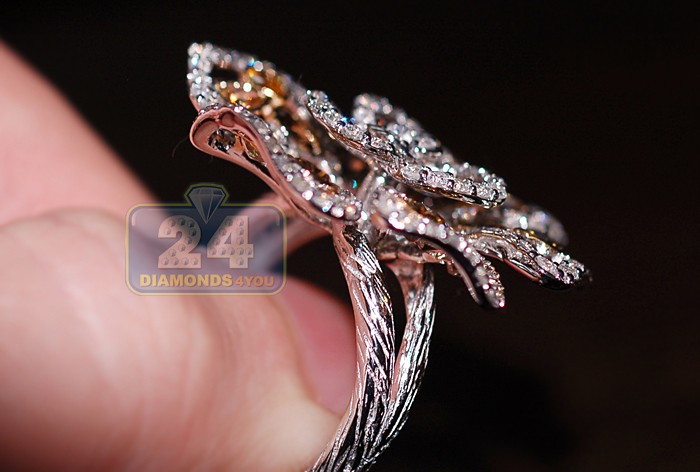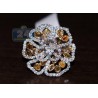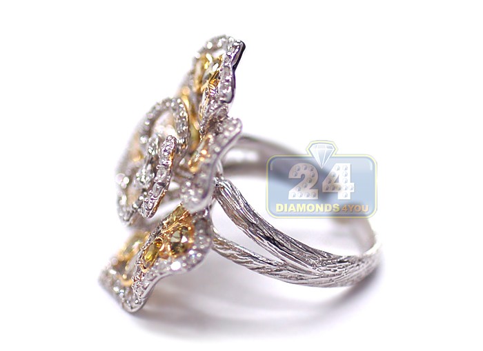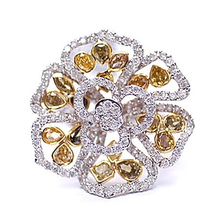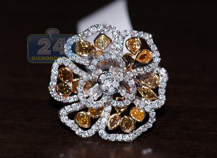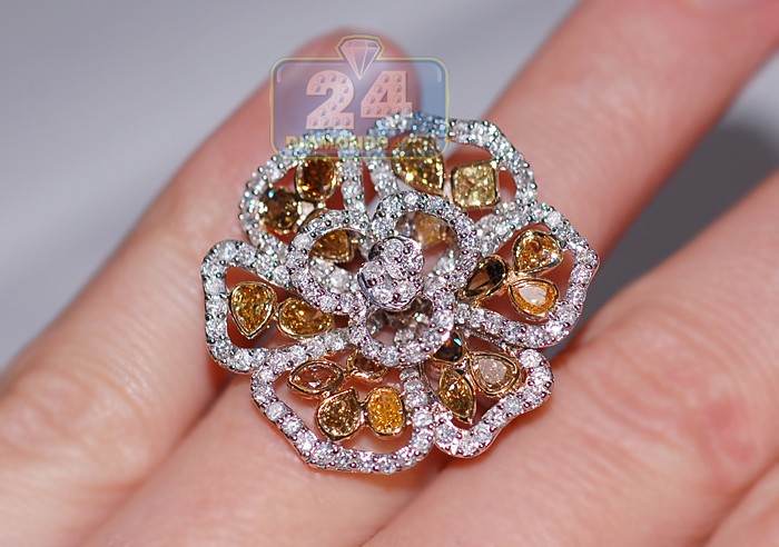 Gorgeously shining with many fancy shadows and colors, our antique styled and nature inspired ring is a timeless treasure! It is professionally handcrafted in cool 14k white gold and has a beautiful flower design covered in shimmering diamonds showcasing plenty of genuine yellow, cognac and classic icy white diamonds weighting 5.10 carat in total. Absolutely breathtaking combination of colors, shapes and fantasy!