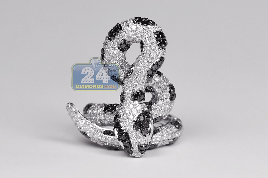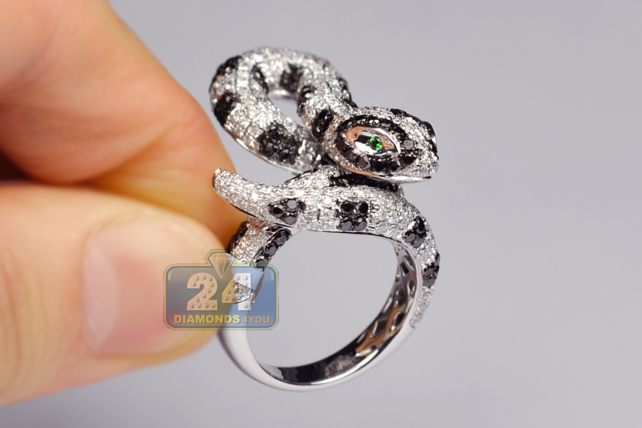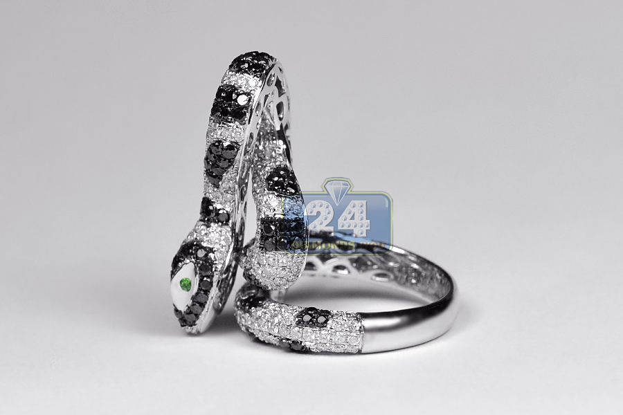 Wow! Our graceful women's snake ring catches attention at first sight! This one of a kind piece is artfully handmade of cool 14k white gold, has highly polished finish, and completely encrusted with genuine white and black round cut diamonds totaling 5.12 carat. Each brilliant is beautifully sparkling and eye clean. Two stunning natural green emeralds are accenting the animal eyes. What a truly great jewel to own!