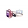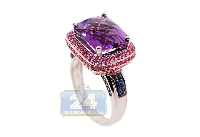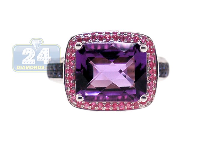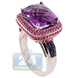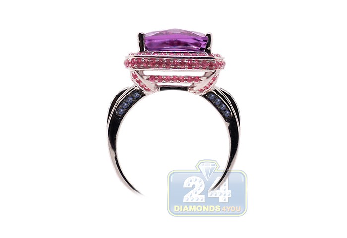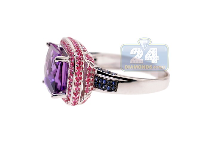 Look at this gorgeous faceted purple amethyst! The gem is masterly handset into highly polished 14k white gold setting and gorgeously surrounded by genuine pink sapphires on the crown. The shoulders of the ring are artfully accented with beautiful blue sapphires to add some contrast to the jewel. Add a fancy mix of colors to jewelry collection with such a special gemstone ring!