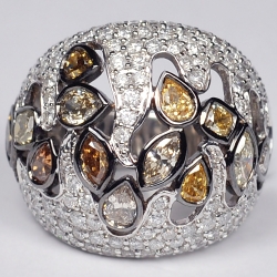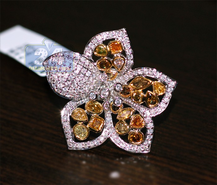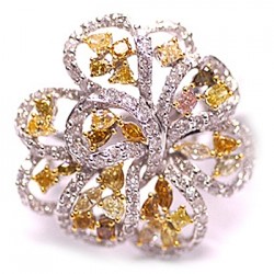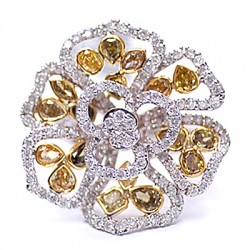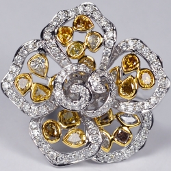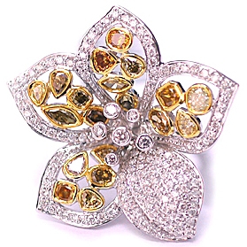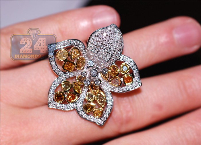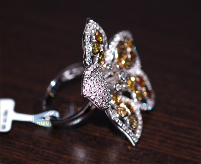 Absolutely extraordinary in design, this lady's cocktail ring is masterly handcrafted in lustrous 14k white gold with perfectly polished finish, and features a beautiful flower design covered in shimmering diamonds showcasing plenty of natural fancy yellow, cognac and classic icy white diamonds. These are eye clean precious stones of top grades. Add such a special jewelry piece to your dressy look!