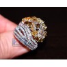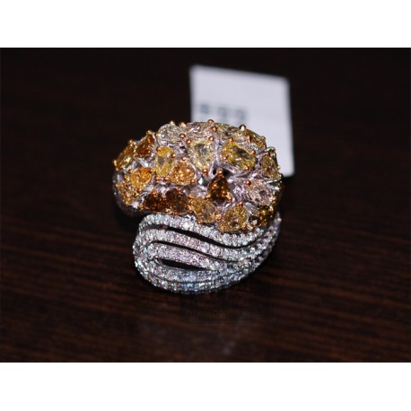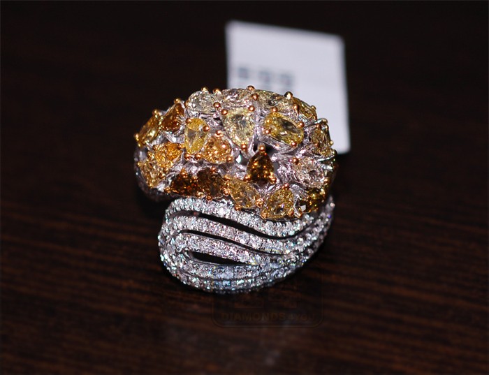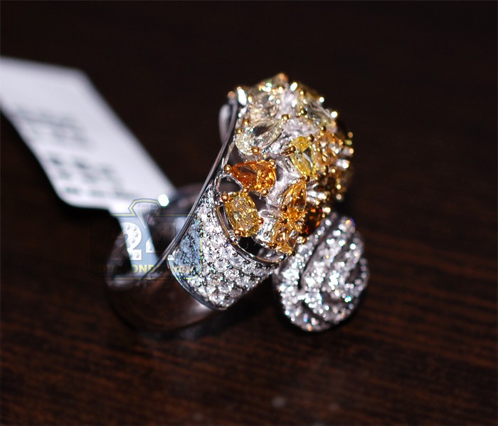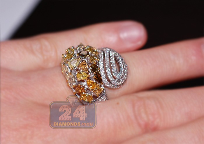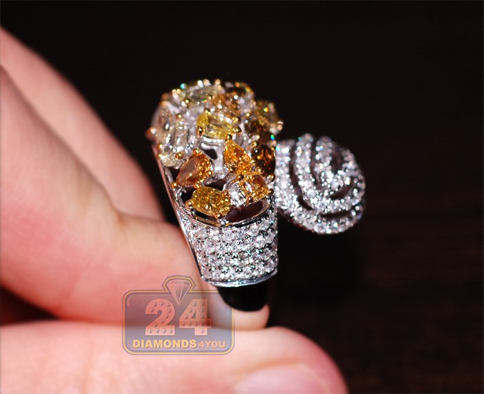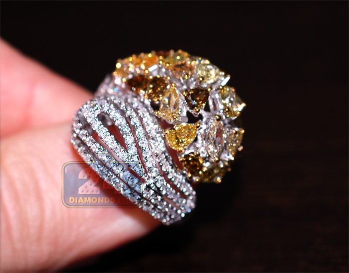 Dress yourself up with something truly unique fascinating! Handcrafted in cool 14k white gold with perfectly polished finish, this special ring features a totally gorgeous dome design covered in dazzling fancy colored yellow, brown and classic icy white diamonds totaling 5.68 carat. These are absolutely natural precious stones of various shape: oval, pear and round. What a magnificent look for someone special!