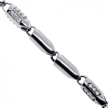 A unique bold design of our diamond bullet chain adds a courageous touch to your look! It's gorgeously created from solid 14 karat white gold, and precisely polished for very shiny smooth finish. The bullet bar links are set with lustrous white round brilliant-cut natural diamonds totaling 5.85 carats (SI1-SI2 clarity, G-H color). This men's diamond chain features 30 inches in length, 6 mm in width and 86 grams in weight. It's secured by a comfortable lobster clasp. Brighten up your neckline in a handsome way!