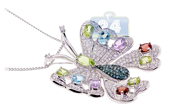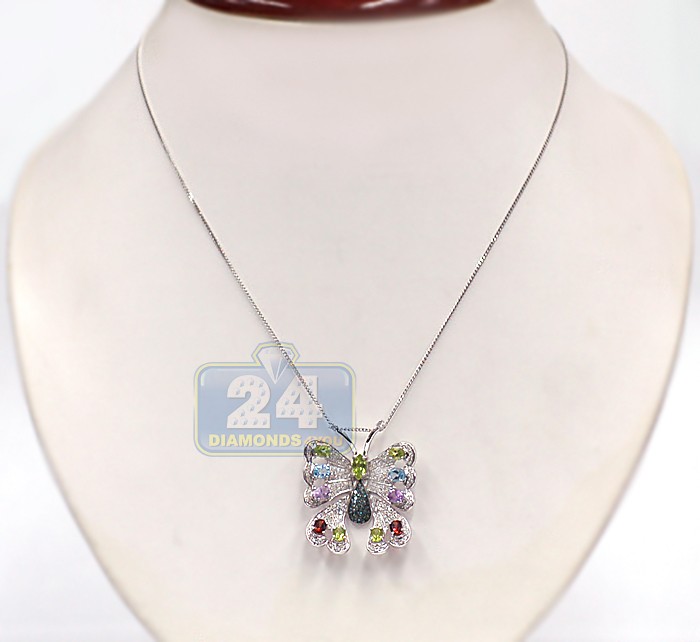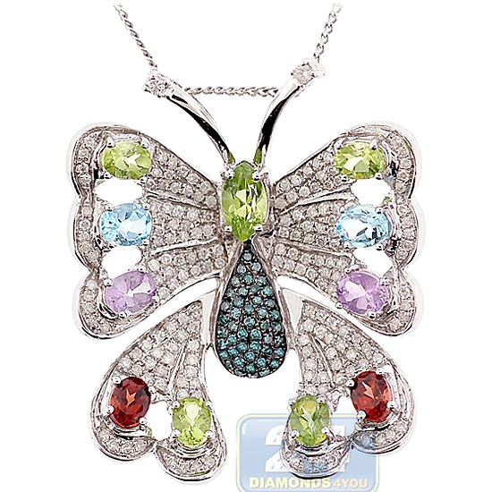 Transform your frame of mind with this exquisite gemstone butterfly pendant! Artfully crafted in solid 14k white gold, it has highly polished shimmering finish. The butterfly pendant feature pear and marquise-cut peridot, amethyst, garnet, blue topaz gemstones highlighted by treated blue and gleaming white round brilliant-cut natural diamonds. Our women's gemstone pendant measures 38 x 30 mm. Dare to wear something spectacular!
