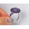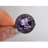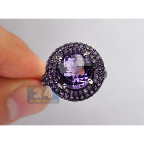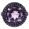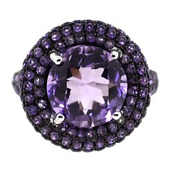 We always have something special for purple lovers! This charming cocktail ring has an unique design artfully handmade of lustrous 14k white gold with highly polished finish and black PVD on the top. The jewel is skillfully encrusted with 1.75 carat of natural round cut amethysts on the sides, and has a genuine large matching gemstone gorgeously placed in the center. You will love feminine sparkle and flair of this exquisite jewelry piece!