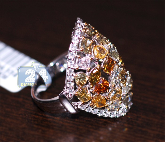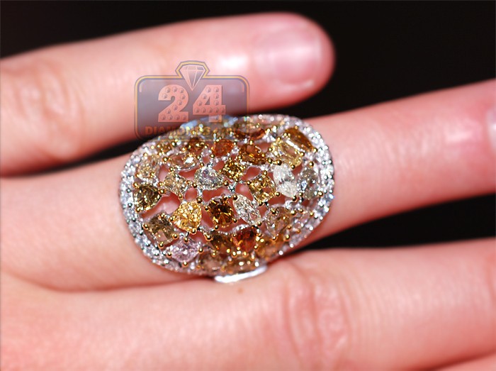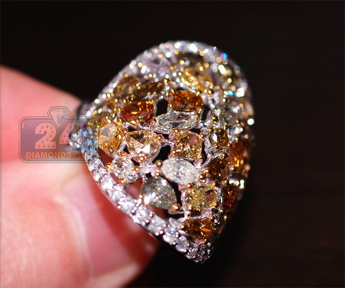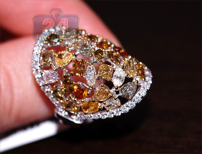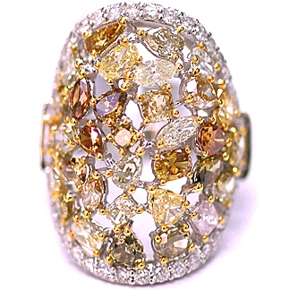 This charming cocktail ring is treasured as a symbol of everlasting love and perfection! It features an impressive combination of colors, shapes, materials and craftsmanship! Amazing green, yellow, brown and classic icy white diamonds... All these stones are absolutely natural and weighting 7.17 carat in total. What a special piece to be on your finger!