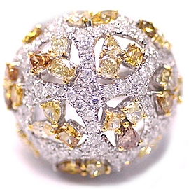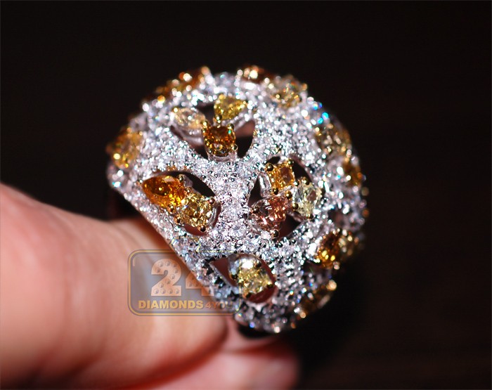 Show your unique taste for luxury with this openwork dome ring! It is artfully handmade of cool 14k white gold with highly polished finish, and features a mix of natural multicolored and classic white diamonds totaling 7.68 carat. These are precious stones of round, oval and pear shapes. Each stone has its unique color and shade. What a gorgeous jewel to treasure forever!