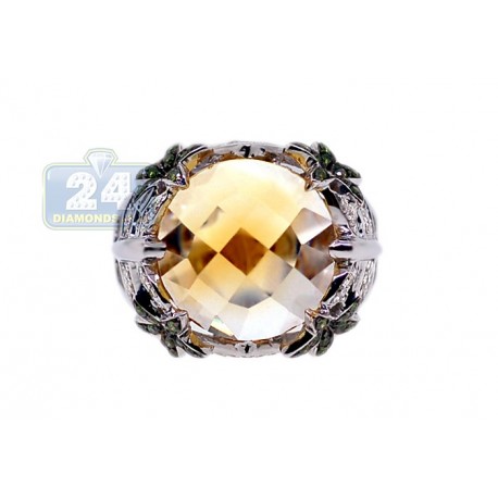 Masterly crafted in cool 14K white gold with high polished finish, this beautiful cocktail ring features a genuine faceted yellow citrine gemstone in the center. The stunning design showcases a vintage inspired floral design with sparkling icy white round cut diamonds and cute green amethyst flowers on the sides of the crown. The summer will stay with you forever with such a fancy ring!
