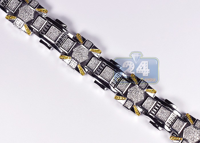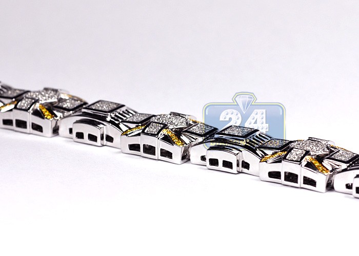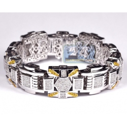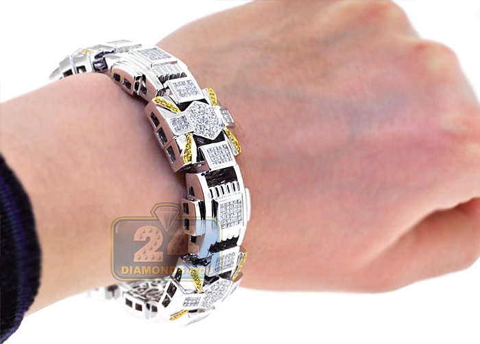 A modern diamond link bracelet in handsome design! This men's wrist bracelet is handcrafted from lustrous 14k white gold, and encrusted with 9.40 carats of white, yellow round- and princess-cut natural diamonds. It measures 9 inches in length and 19 mm in width. Amaze your wrist with such a good-looking diamond link bracelet!