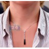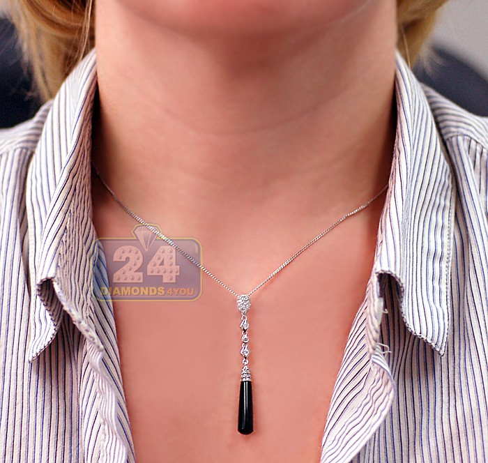This sophisticated diamond dangle pendant sparkles with dazzling icy white round brilliant-cut natural diamonds of 0.57 carat. A classic design of high-polished 14 karat white gold is studded with mysterious black ceramic and accented with glistening white diamonds. Our women's diamond pendant measures 55 mm in total length and 6 mm in width. Dare to wear something spectacular!
