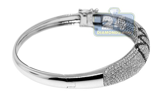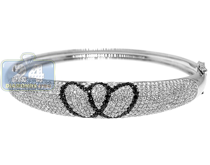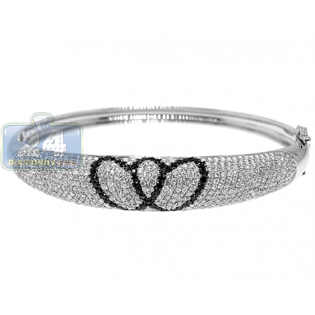 Illuminate your wrist with romantic beauty - our diamond heart bracelet! Artfully crafted in cool 14k white gold, it has highly polished sparkling finish. This round bangle bracelet is paved with 3.80 carats of icy white and black round-cut natural diamonds. The piece also has inner length of 6.5 inches and variable width from 7 to 12 mm. This women's wrist bracelet will bring a warm, glowing touch to your favorite looks!