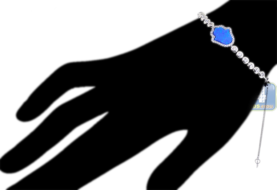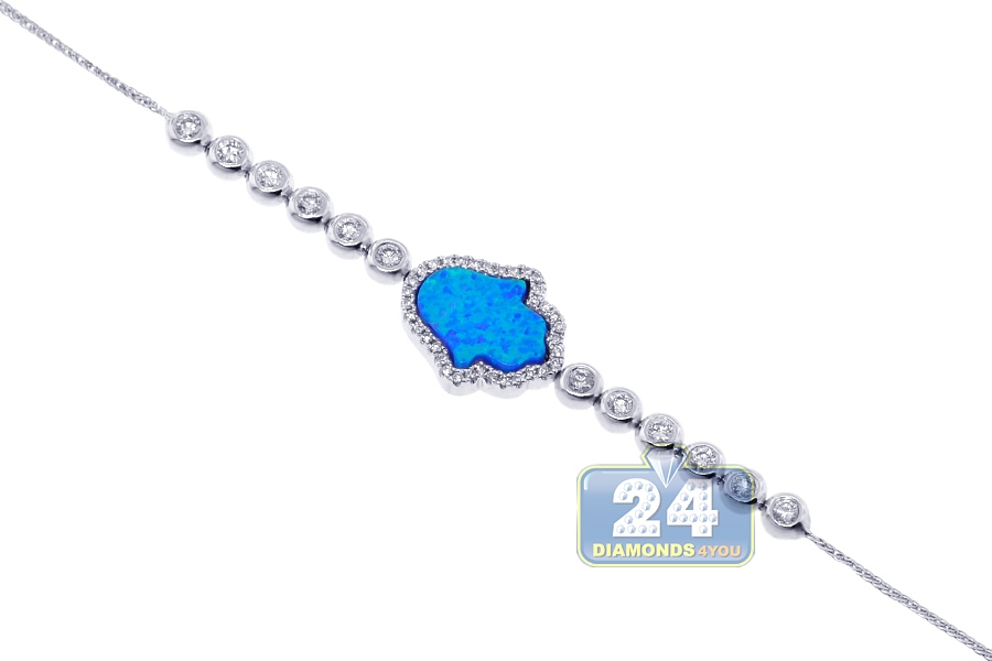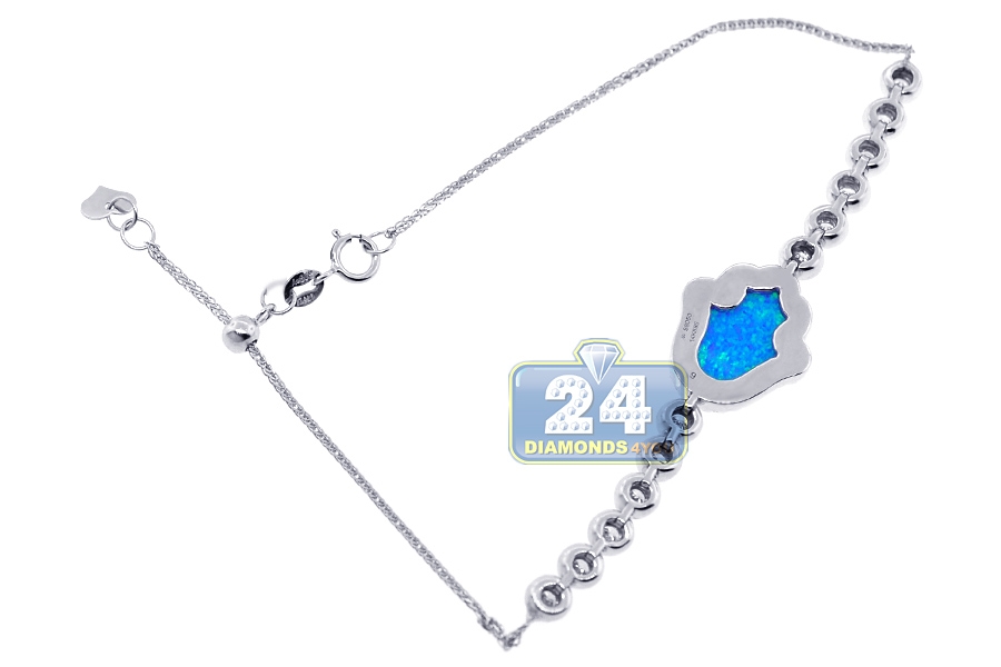 14K White Gold Diamond Blue Opal Hamsa Hand Womens Bracelet