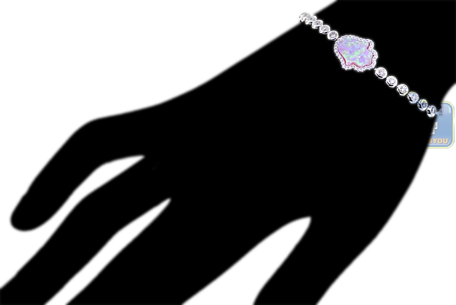 14K White Gold Diamond Pink Opal Hamsa Hand Womens Bracelet