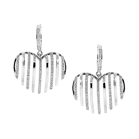 Indulge in the beauty and sophistication of diamonds in these original striped heart earrings! Artfully handmade of cool 14 karat white gold, they're highly polished for ultra shiny finish. Our women's drop earrings are adorned with icy white round brilliant-cut natural diamonds (0.68 carat). The pair measure 27 mm in hanging length and 17 mm in width. Perfect to wear for any occasion!