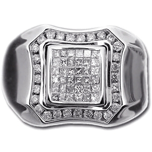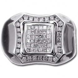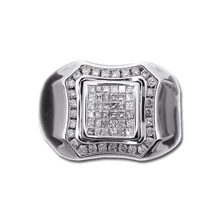 Our bold ring is so masculine and impressive! High polished 14k white gold setting gleams with square shaped center piece invisibly set with genuine princess cut diamonds and bordered by classic round cut stones. All brilliants are weighting 1.10 carat in total, and feature G-H color and SI1-SI2 clarity which makes them absolutely sparkling and eye clean. Get ready to be always in fashion with this timeless jewelry piece!