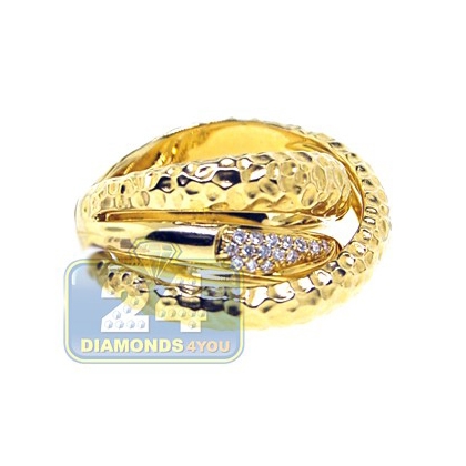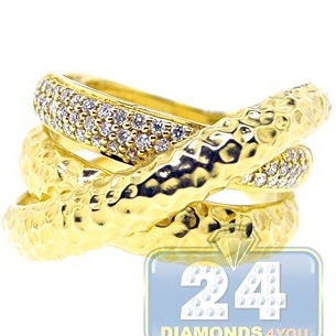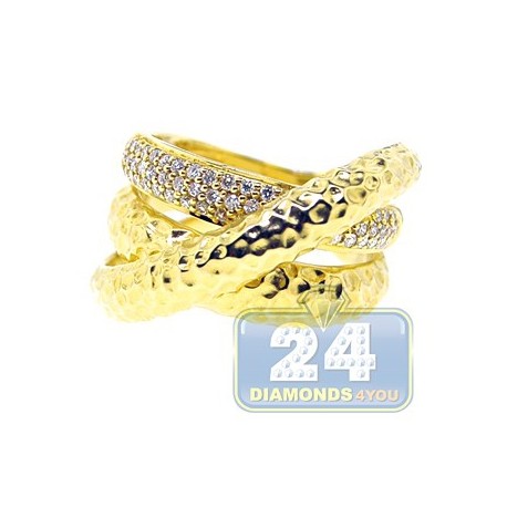 Absolutely fancy bamboo pattern is covering these twisted bands gorgeously handmade of classic 14k yellow gold with perfectly polished finish. Glittering round cut diamonds are masterly accenting in one of the glowing bands. Each brilliant features G-H color and SI1-SI2 clarity. Such a special design would be a great addition to your jewelry collection!
