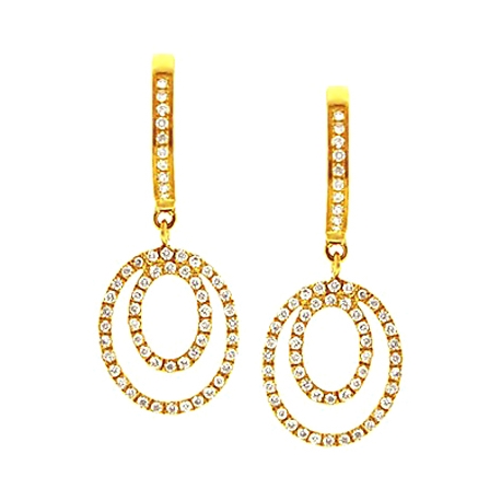 These fabulous diamond drop earrings feature an elegant triple circle design. They're masterly produced from warm 14k yellow gold with high-polished shiny finish. Our women's layered earrings are set with 0.35 carat of icy white round-shaped genuine diamonds. They also have height of 25 mm and width of 10 mm. There's no wrong occasion to wear these diamond dangle earrings, and they never go out of style!
