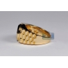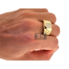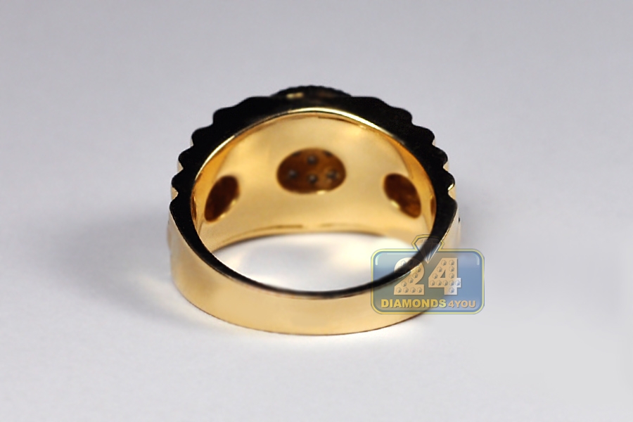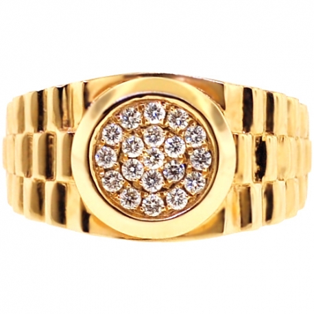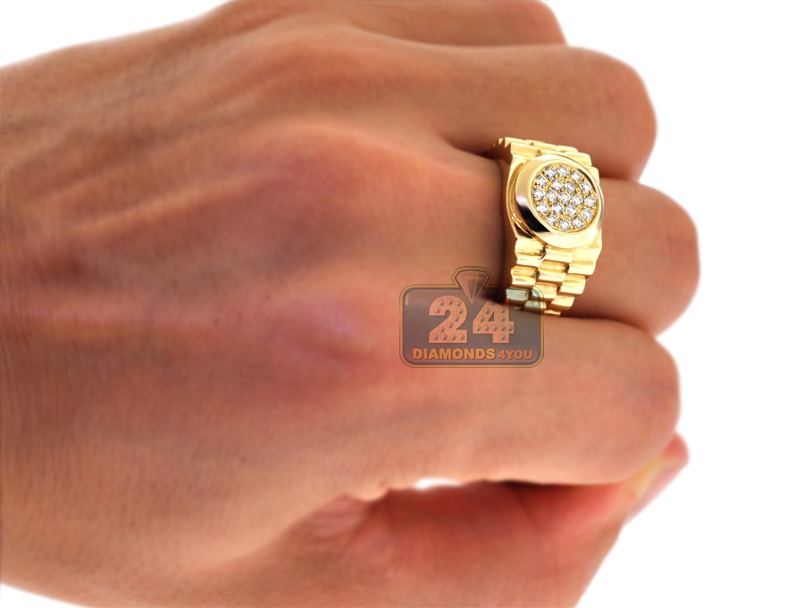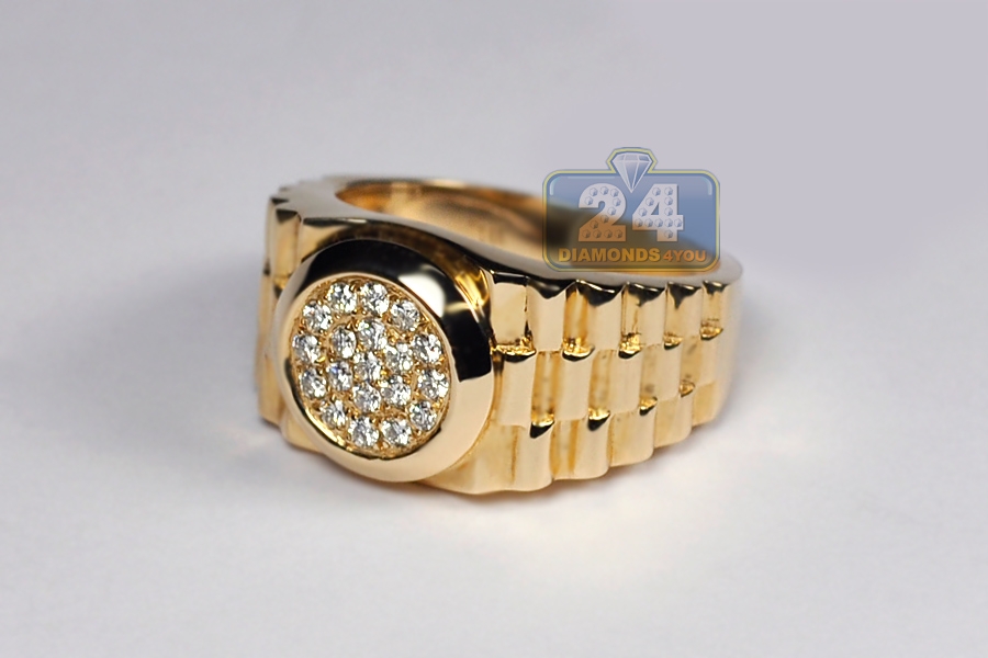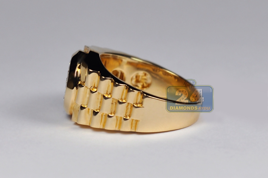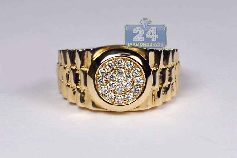 Show off your interesting sense of style with our stepped shank ring! Expertly manufactured from hot 14k yellow gold, it's polished to have a very sparkling smooth look. This men's band ring is accented with 0.50 carat of icy white round brilliant-cut genuine diamonds. The widest part measures 13 mm, and the shank is 4 mm. Our diamond pinky ring will be a handsome complement to evening attire!