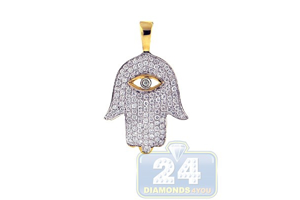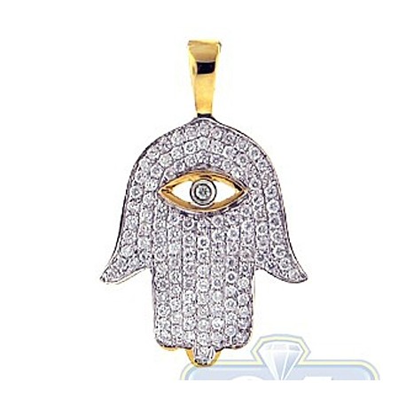Our Hamsa Hand pendant features a truly unique design with protective evil eye in the middle! Skillfully produced from solid 14 karat yellow gold, it has highly polished shiny finish with white rhodium accents. The Hamsa pendant is paved with gleaming white round brilliant-cut real diamonds of 0.59 carat, SI1-SI2 clarity and G-H color. This piece of jewelry fits perfectly both men and women, and measures 27 mm in total length and 17 mm in width. The diamond Hamsa Hand is thought to offer protection from the evil eye!