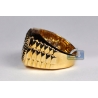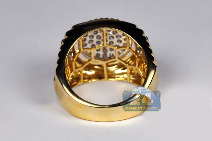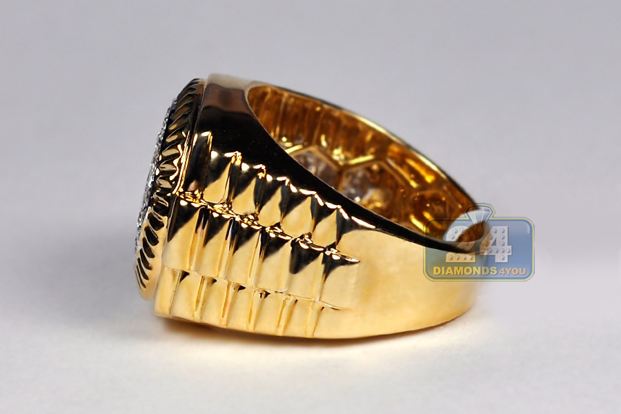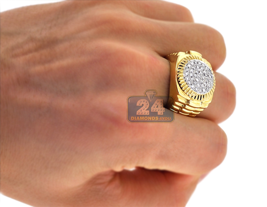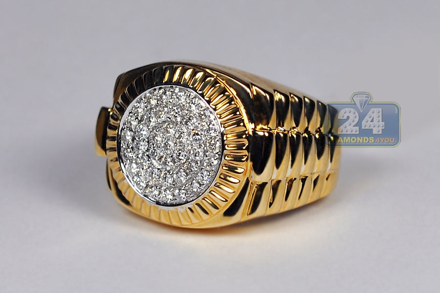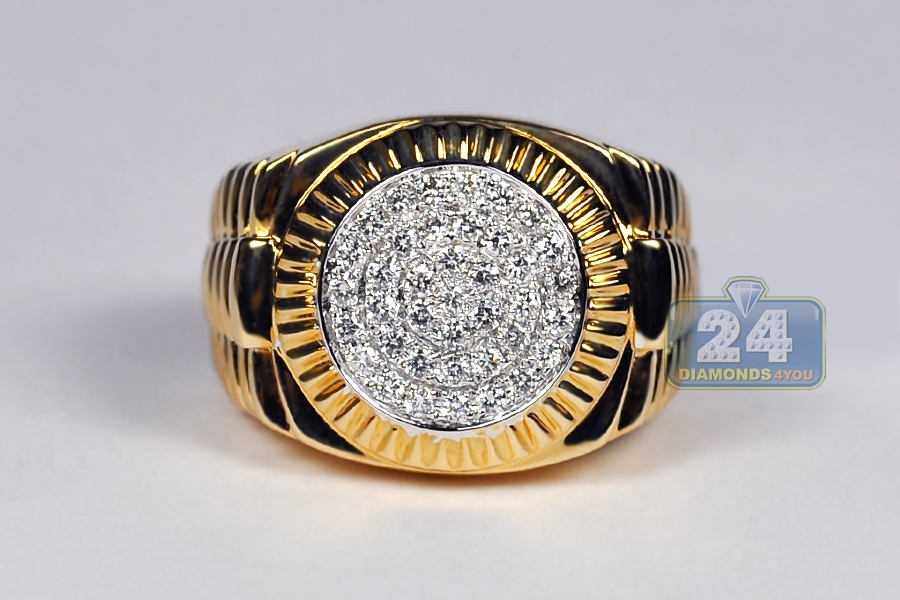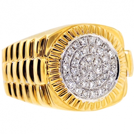 Fluted bezel of our men's diamond ring makes it a unique creation! Artfully created from warm 14k yellow gold, it's highly polished for sparkling smooth finish. The jewelry features 0.60 carat of icy white round brilliant-cut genuine diamonds. There is also step design on the sides. Measuring 18 mm in width, this signet ring is a handsome addition for any collection!
