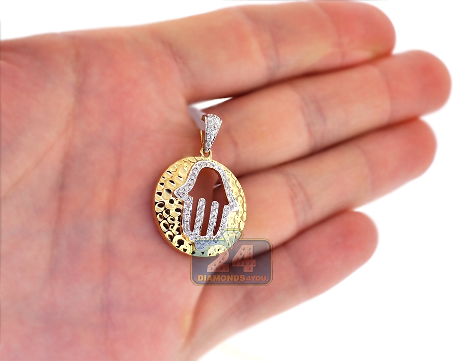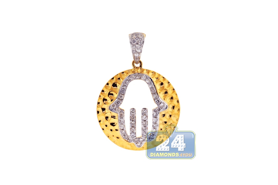 14K Yellow Gold 0.62 ct Diamond Hamsa Hammered Pendant