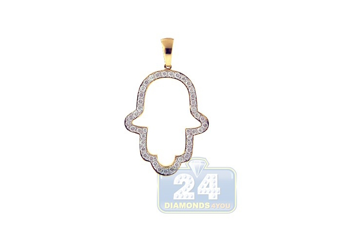This Jewish Hamsa Hand pendant is also known as the Hand of Miriam! It's expertly created from solid 14k yellow gold, and highly polished for shimmering look. Men's religious pendant is encrusted with lustrous white round brilliant-cut natural diamonds, all weighting 0.85 carat (SI1-SI2 clarity, G-H color). Hamsa Hand pendant measures 40 mm in total height and 25 mm in width. The diamond Hamsa pendant is thought to offer protection from the evil eye!