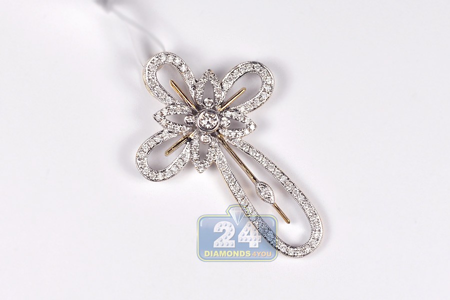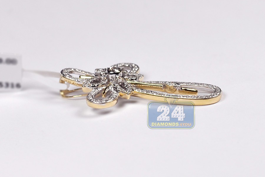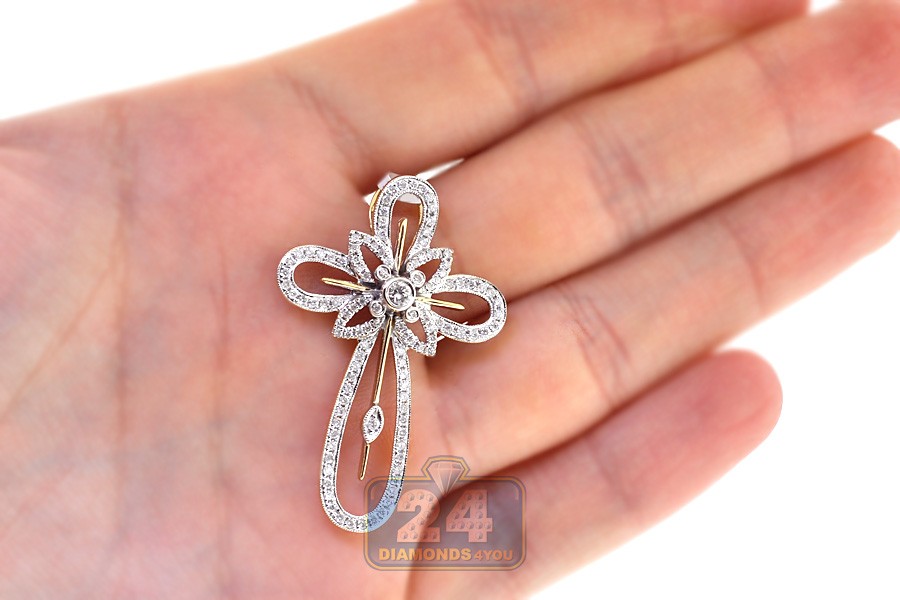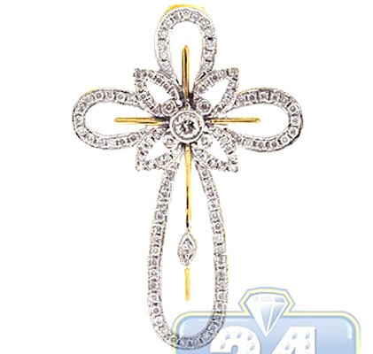 Our diamond cross pendant features halo design with vintage motif! Skillfully crafted in warm 14k yellow gold, it has highly polished shiny finish with bright white rhodium accents. The religious cross pendant is accented with gleaming white round brilliant-cut genuine diamonds, all weighting 0.92 carat. This men's diamond pendant measures 42 x 28 mm. The religious piece of jewelry is just a perfect addition to your everyday look!