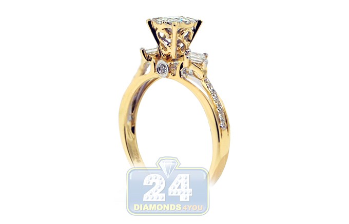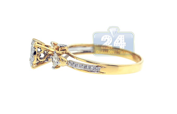 This vintage inspired bridal is surely any woman's dream! The round cluster of brilliants is high mounted in a crown setting that is masterly handmade of warming 14k yellow gold with high polished finish. The crown is gorgeously accented with 2 sparkling princess cut diamonds (0.20 ct) on both sides. Ring's shoulders are skillfully handset with glistening rows of round shaped diamonds (total weight of round diamonds is 0.54 ct). Make her feel like a queen with such a special engagement ring!