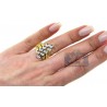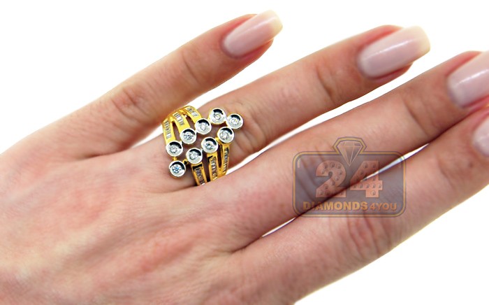 Simply unique and sophisticated! This lady's ring features an openwork abstract design expertly handmade of warming 14k yellow gold with highly polished finish. Nine genuine round cut diamonds are encrusted on the top while the band is accented with three rows of baguette diamonds on each side. Absolutely bright and fascinating look!