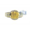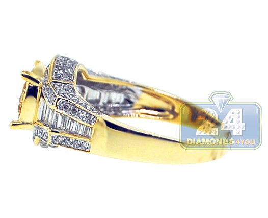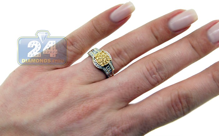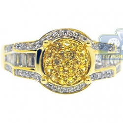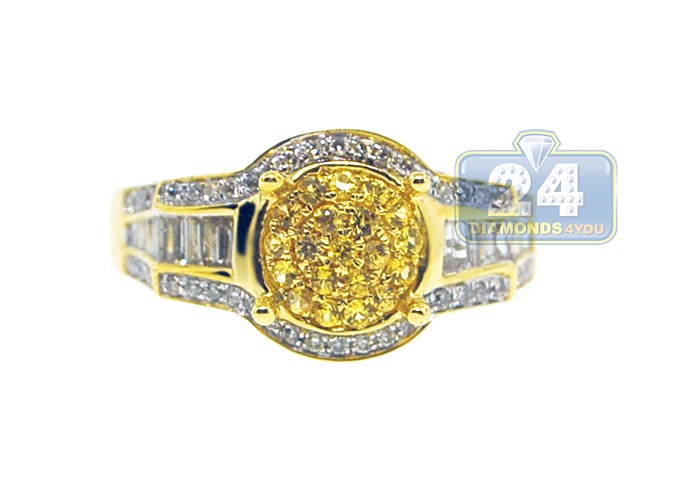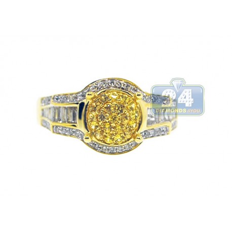 Add some fancy colors and gemstones to your engagement ring! This absolutely elegant bridal piece is masterly handcrafted in classic 14k yellow gold with highly polished finish, and skillfully accented with genuine white round and baguette diamonds on sides while the centerpiece is gorgeously filled with natural yellow sapphires. Simply stunning combination of colors, materials and craftsmanship!