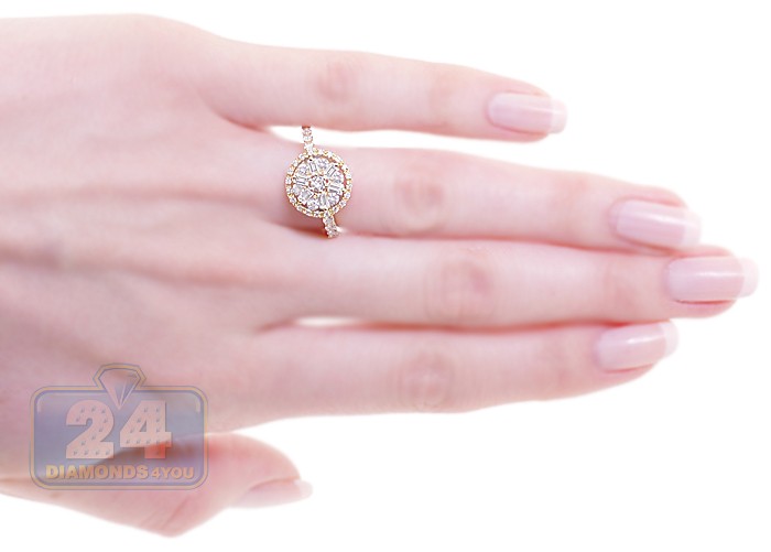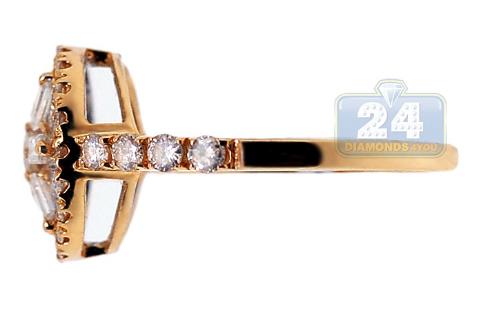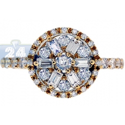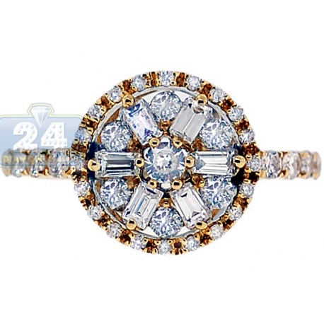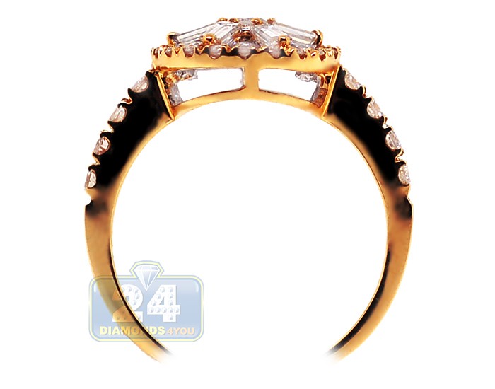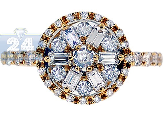 Our gorgeous diamond engagement ring sparkles with love and beauty! Its design features the intricate and unique shape forming a gorgeous flower. Amazing mix of round (0.67 ct) and baguette (0.34 ct) cut diamonds makes this ring look even more exquisite! The ring's setting is skillfully handcrafted in warm 14k yellow gold with highly polished finish, and accented with four genuine diamonds on each side. This engagement ring will definitely sweep her of her feet with its elegance and exclusive design!