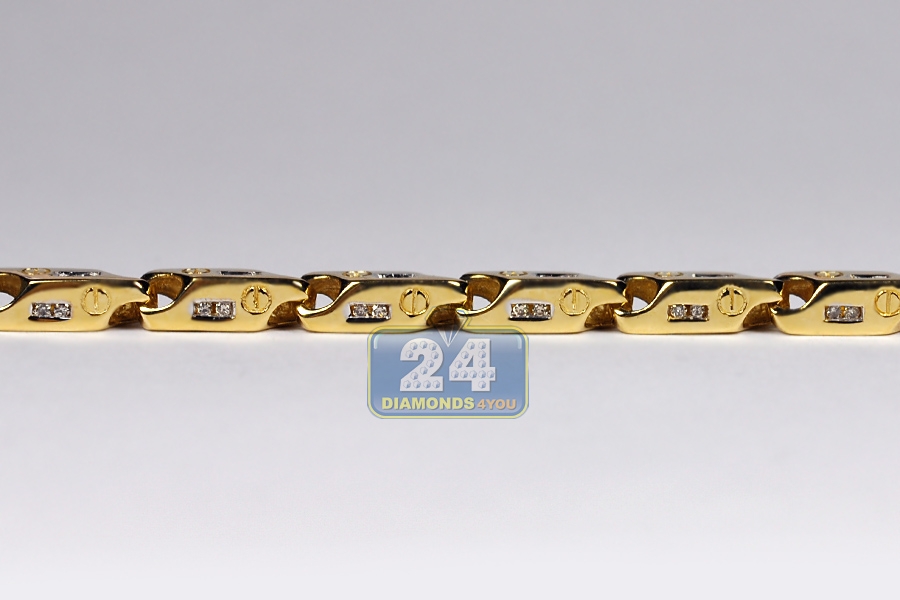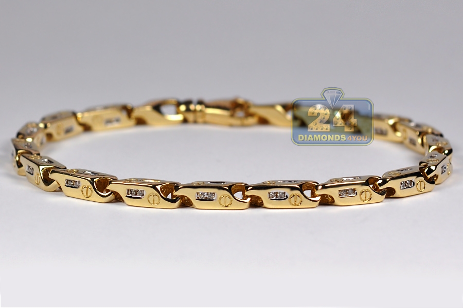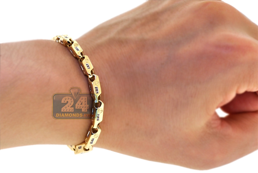 Our men's diamond bracelet graces the wrist with a unique design of rectangular links! It's artfully produced from warm 14k yellow gold with highly polished shiny finish. The piece of jewelry is also accented with 1.09 carat of white round brilliant-cut natural diamonds. It features 9.25 inches in length, 4.5 mm in width; and secured by a comfortable lobster claw closure. Now is the time to sparkle wearing this elegant bar link bracelet!