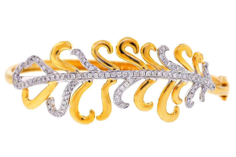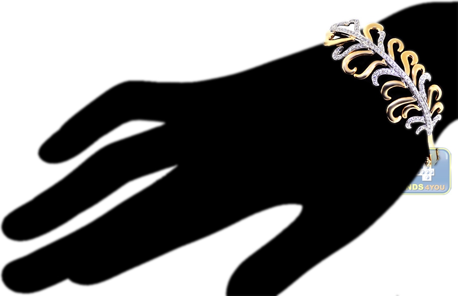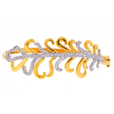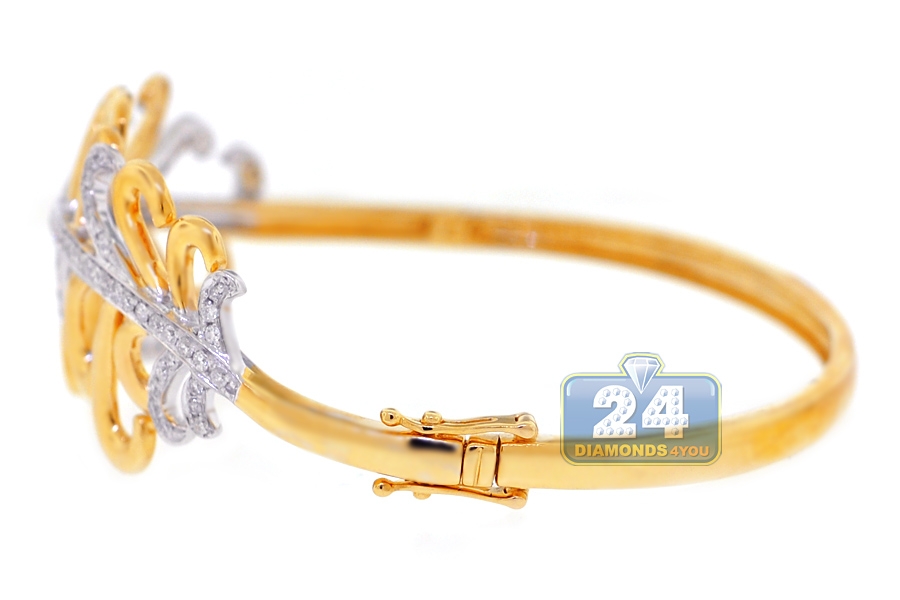 Wear this breathtaking diamond flower bangle for a special occasion! It's professionally handmade of hot 14 karat yellow gold, and encrusted with 1.24 carat of icy white round brilliant-cut genuine diamonds. Our women's diamond bangle measures 7.75 inches in length and 23 mm in width. Make a sparkling statement wearing this diamond bangle bracelet!