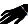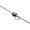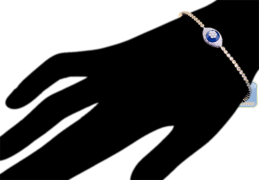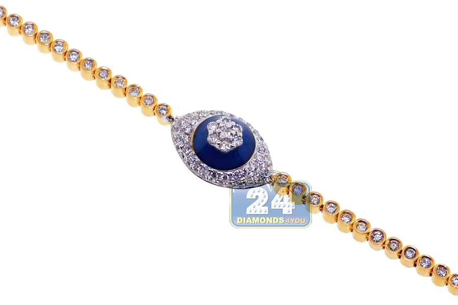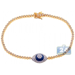 This diamond tennis bracelet is created to protect against the evil eye! Professionally made of hot 14 karat yellow gold, it has highly polished shiny finish. The evil eye links is accented with blue enamel and cluster of icy white round brilliant-cut genuine diamonds. Total stone weight is 1.47 carat. Our women's diamond bracelet measures 7.5 inches in length, and 9-2 mm in width. Accentuate your beauty with this diamond evil eye bracelet!