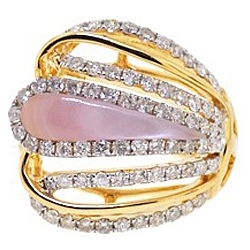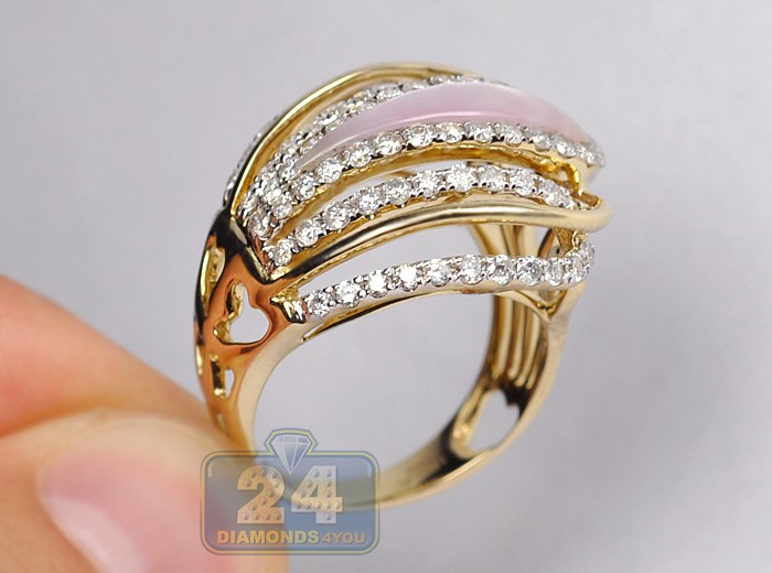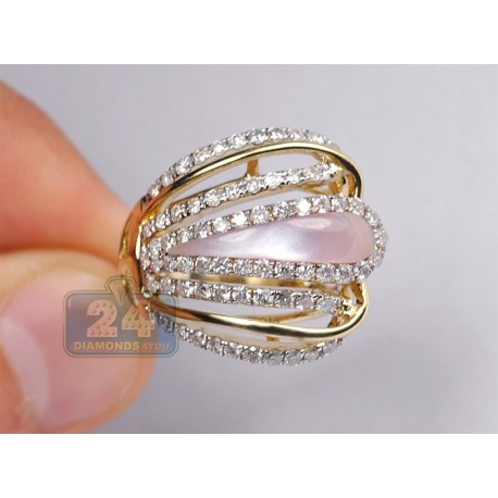 There is something so chic, so captivating in this women's ring! It features high polished 14k yellow gold setting with openwork design, and masterly encrusted with pink opal and 1.55 carat of white round cut diamonds. All brilliants are eye clean and sparkling, with SI1-SI2 clarity and G-H color. What a delightful ring for gemstone lovers!
