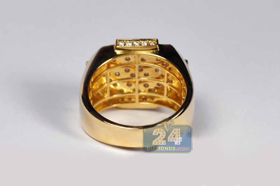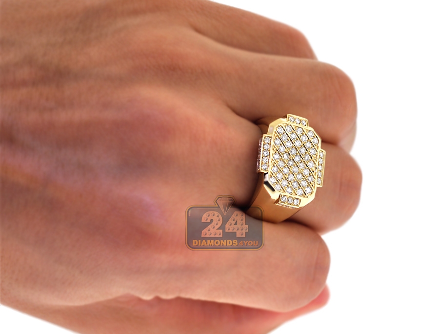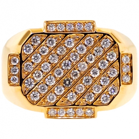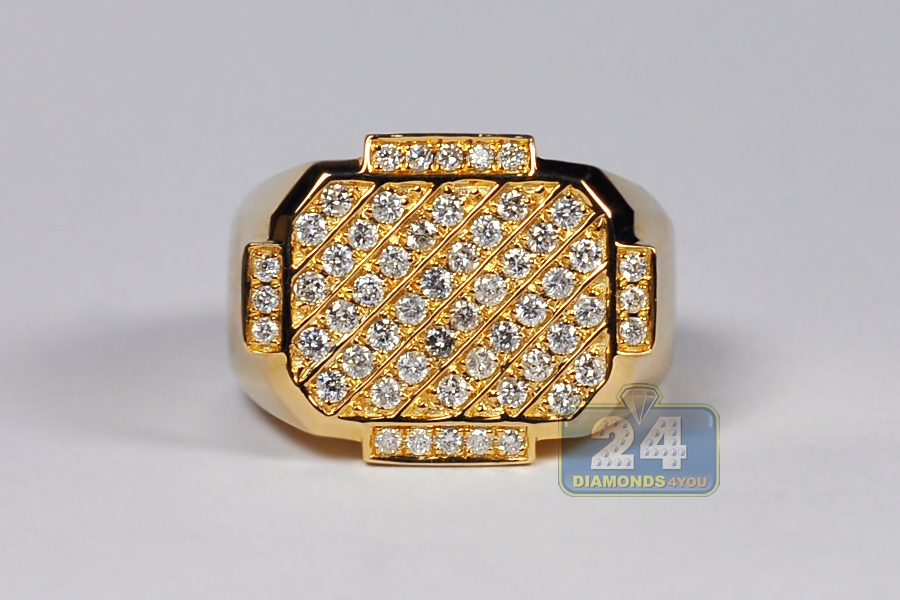 Our diamond pinky ring is a handsome piece to talk about! Masterly produced from warm 14 karat yellow gold, it's highly polished to have very smooth lustrous finish. This rectangle-shaped ring is encrusted with 1.55 carat of icy white round brilliant-cut natural diamonds. The top measures 17 mm in width, and the shank is 5 mm. Our men's diamond ring will help you get ready for the next fancy event!