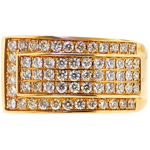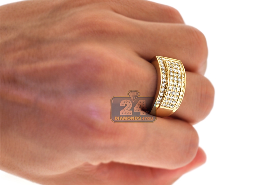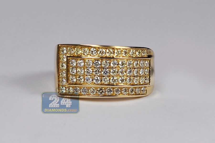 This men's diamond ring adorns the finger in a spectacular rich way! Designed in original slanted style, it's expertly crafted in warm 14 karat yellow gold, and high-polished to have very sparkling smooth finish. Our slanted band ring is encrusted with 1.55 carat of icy white round brilliant-cut natural diamonds. The widest part of the piece measures 12 mm, and the shank is 3 mm. This diamond band for men will stay in your jewelry collection for life!