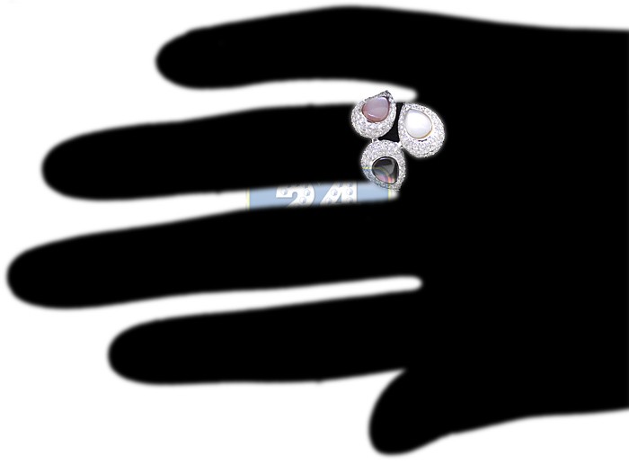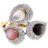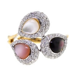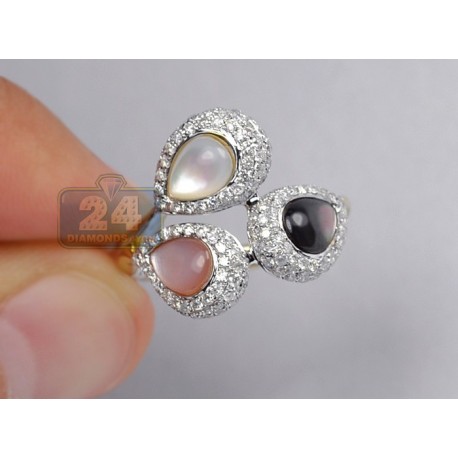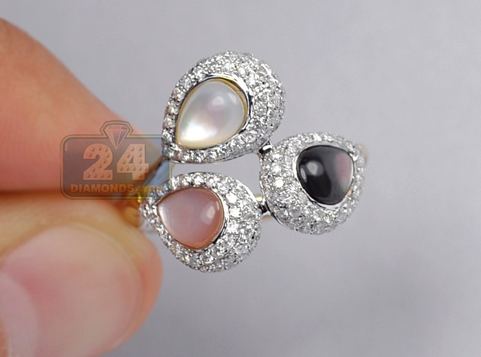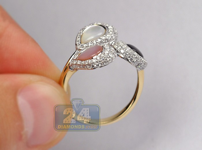 There is something so attractive, so charming about this gemstone cocktail ring! It features an elegant setting with openwork design that is handmade of sunny 14k yellow gold with highly polished finish, and masterly encrusted with three genuine multi colored opals as well as rows of white round cut diamonds. A delightful ring for opal lovers!